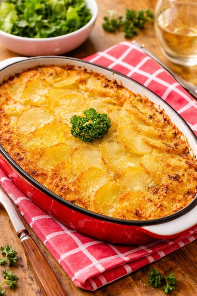 Instructions 1. Preheat oven to 200°C (390°F). Finely chop onions. Drain and chop anchovies. 2. Peel and slice potatoes into thin rounds (5 mm). 3. Melt 40 g butter and sauté onions for 5 minutes without browning. Butter a baking dish. 4. Layer potatoes, onions and anchovies. Season lightly with salt and pepper. Repeat layers, finishing with potatoes. 5. Heat cream and milk and pour over the dish. Sprinkle breadcrumbs and add remaining butter. 6. Bake for 45 minutes until golden and tender.